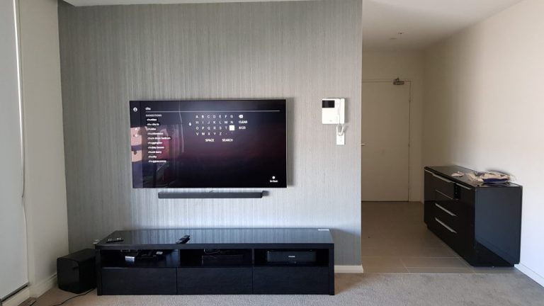 Samsung 55″ QLED TV and Soundbar Mounted on Gyprock